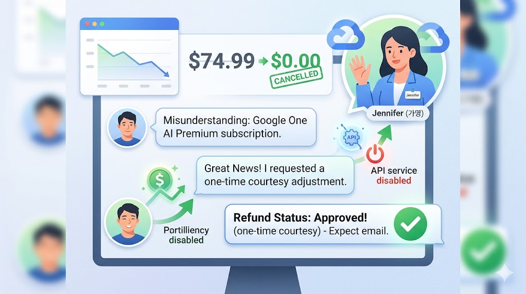 사용자: 아, Gemini API가 무료 크레딧에서 제외되는지 몰랐습니다. 간단한 테스트를 위해 짧게 사용했을 뿐인데 이렇게 높은 금액이 청구될 줄은 몰랐네요. 신규 사용자로서 실수한 부분이니, 이번 한 번만 예외적으로 환불을 도와주실 수 있을까요? 추가 문제를 방지하기 위해 계정은 이미 해지했습니다.