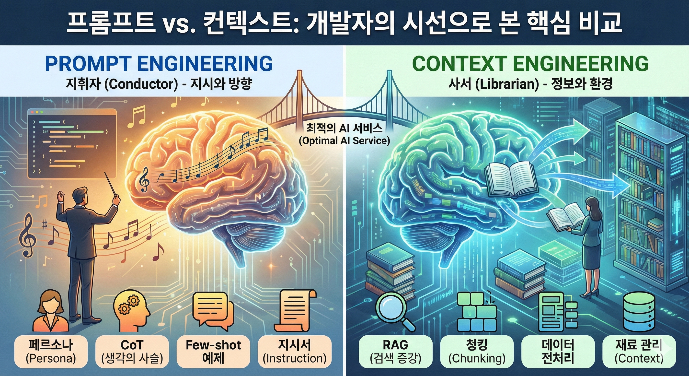 | 핵심 역할 | 지휘자 (Conductor): 모델에게 행동 양식과 톤을 지시 | 사서 (Librarian): 모델에게 필요한 책과 자료를 제공 |