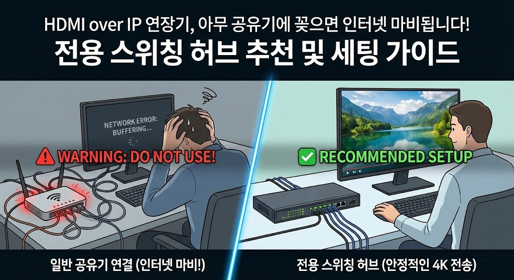 HDMI over IP 연장기, 아무 공유기에 꽂으면 인터넷 마비됩니다! 전용 스위칭 허브 추천 및 세팅 가이드