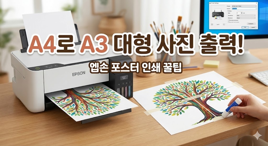 안녕하세요! 일상 속 유용한 정보를 나누는 블로그입니다.가끔 A3 크기의 큰 사진이나 공고문, 도면을 출력해야 하는데, 사무실이나 집에 있는 건 A4 용지만 들어가는 일반 프린터뿐이라 난감하셨던 적 있으신가요?"인쇄소에 가야 하나?" 고민하지 마세요! 대부분의 엡손(Epson) 프린터에는 A4 용지 여러 장을 이어 붙여 큰 그림을 만드는 '포스터 인쇄(분할 인쇄)' 기능이 숨어 있답니다.오늘은 A4 프린터로 A3 크기(2배) 출력하는 초간단 방법을 알려드릴게요. 1. 준비물출력할 고화질 이미지 파일A4 용지 2장가위 또는 칼, 풀 (이어 붙이기용)2. 엡손 프린터 드라이버 설정하기이 기능은 윈도우 기본 뷰어나 알씨 등에서 바로 설정하는 게 아니라, **'프린터 속성'**에서 바꿔줘야 합니다.① 인쇄(Ct..