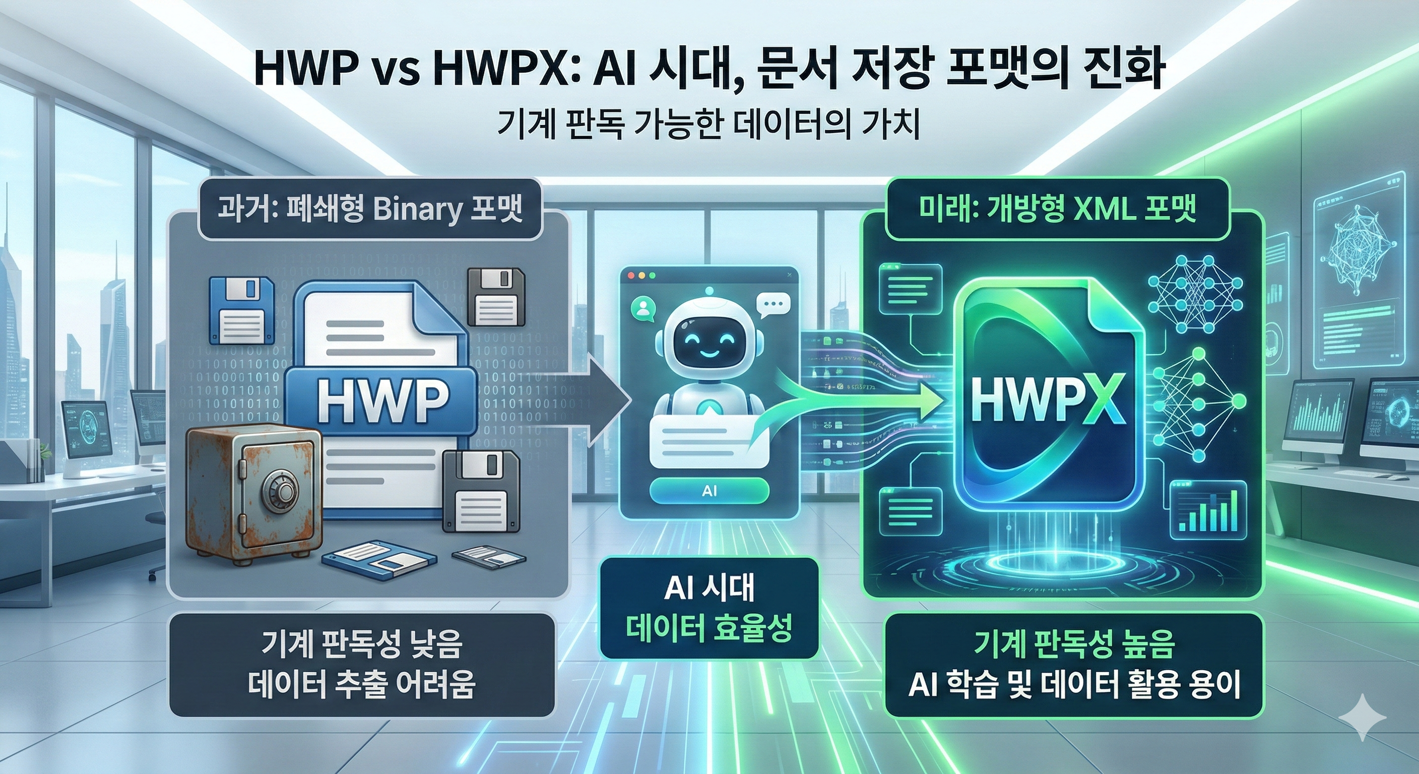 매일 컴퓨터 앞 앉아 문서를 작성하고, 보고서를 만들고, 기획서를 쓰면서 무심코 누르는 '저장' 버튼. 보통 파일 이름에는 신경을 쓰지만, 그 뒤에 붙는 확장자에는 크게 관심을 두지 않는 경우가 많습니다. "어차피 한글 프로그램에서 열리는 건 똑같잖아?"라고 생각하실 수도 있습니다.하지만 지금처럼 인공지능(AI)이 산업의 패러다임을 바꾸고 있는 시대에, 문서의 끝에 붙는 세 글자 **'hwp'**와 네 글자 **'hwpx'**의 차이는 단순한 알파벳 하나의 차이가 아닙니다. 이는 과거의 '종이 문서' 시대로 머물 것인가, 아니면 다가오는 '지능형 데이터' 시대로 나아갈 것인가를 결정짓는 매우 중요한 갈림길입니다.오늘 이 글에서는 두 포맷이 기술적으로 어떻게 다른지, 그리고 AI 시대에 저장 포맷이 왜 기..