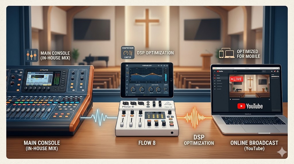 온라인 예배가 사역의 중요한 축으로 자리 잡은 오늘날, 많은 교회가 직면하는 고민은 "현장 소리는 좋은데, 유튜브 송출 소리는 왜 작고 답답할까?"라는 질문입니다. 현장 음향은 공간의 울림을 고려하여 믹싱되지만, 이어폰이나 스마트폰 스피커로 듣는 온라인 성도들에게는 완전히 다른 프로세싱이 필요하기 때문입니다.오늘은 베링거(Behringer)의 스마트 디지털 믹서인 Flow 8을 '송출 전용 서브 믹서'로 활용하여, 메인 콘솔의 소리를 유튜브에 최적화된 고품질 사운드로 재가공하는 전문적인 방법을 상세히 살펴보겠습니다. [베링거BEST] 베링거 FLOW8 오디오 믹서 USB 오디오 인터페이스 - 믹서/인터페이스 | 쿠팡쿠팡에서 [베링거BEST] 베링거 FLOW8 오디오 믹서 USB 오디오 인터페이스 구매하..