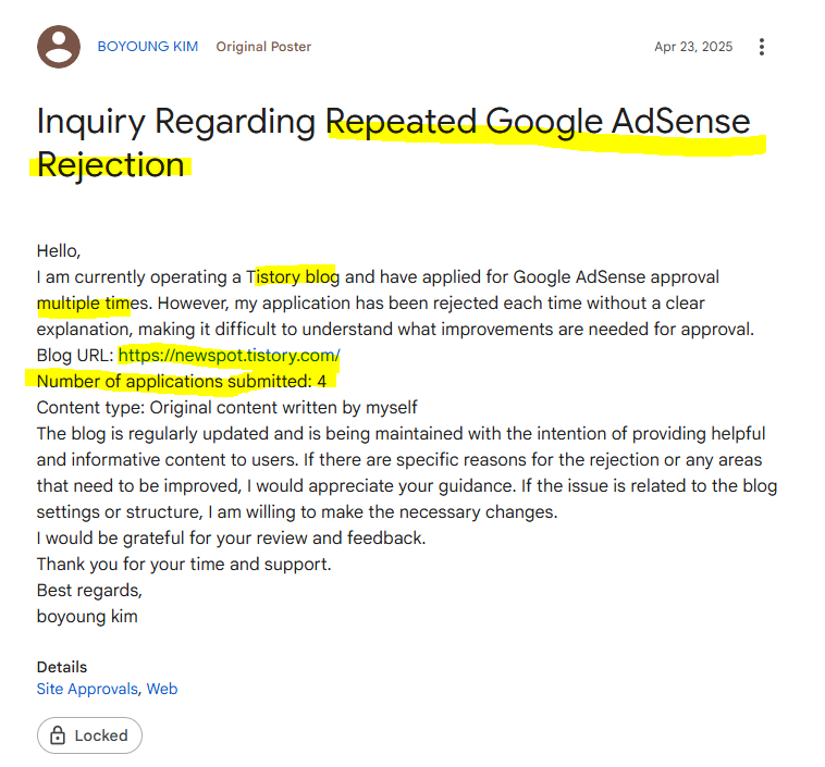많은 블로거가 사용하는 *.tistory.com 형태의 하위 도메인(Subdomain)은 2026년 현재 구글 애드센스 심사에서 **'극상'**의 난이도를 자랑합니다. 구글 공식 포럼의 최고 전문가들조차 하위 도메인으로는 승인 통과가 거의 불가능에 가깝다고 지적할 정도입니다.