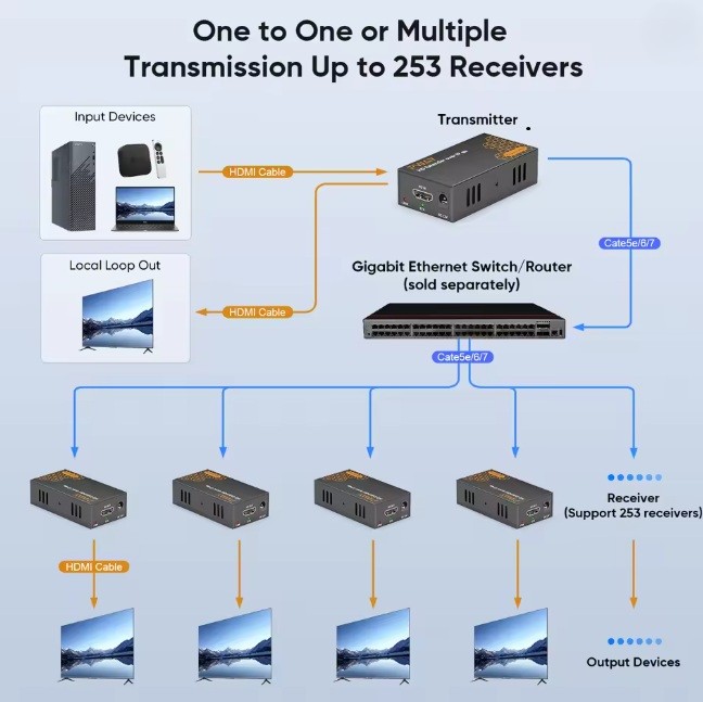 👉 HDMI over IP 익스텐더를 구매하세요. 스위치 허브를 통해 원하는 만큼 TV를 늘릴 수 있습니다.